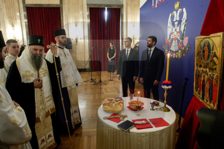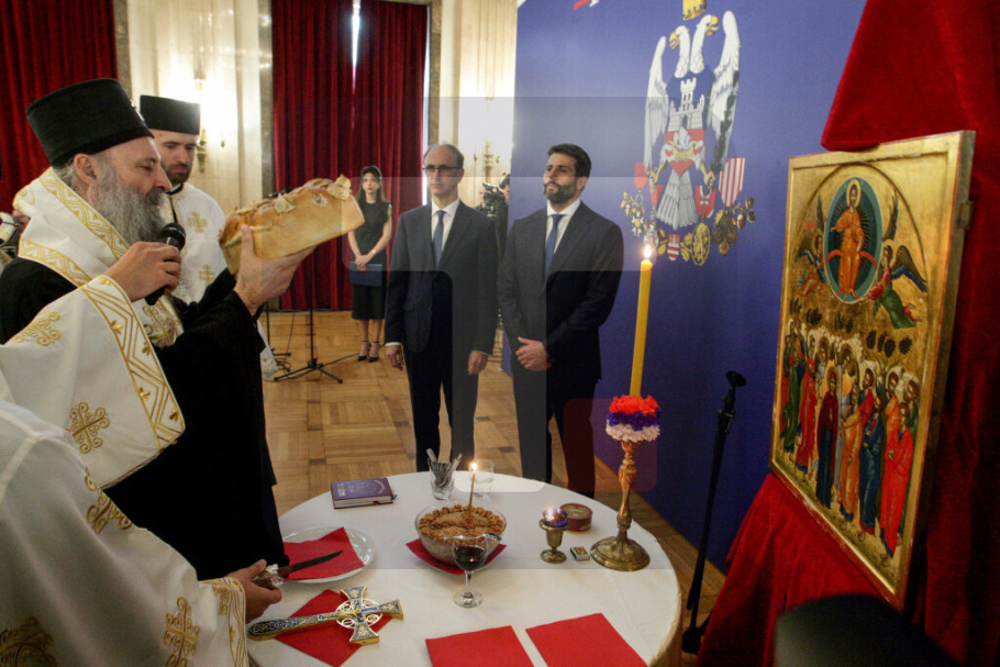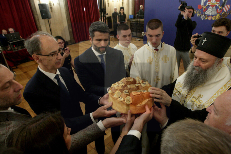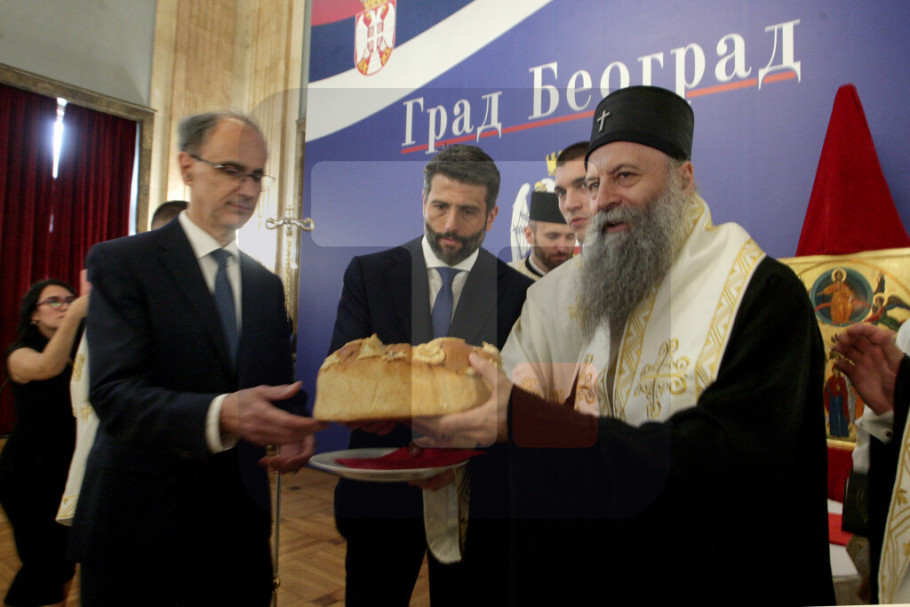 BEOGRAD - U Skupštini grada Beograda danas je proslavljena gradska slava Spasovdan lomljenjem slavskog kolača u prisustvu srpskog patrijarha Porfirija, predsednika Vlade Srbije Đura Macuta i gradonačelnika Beograda Aleksandra Šapića.