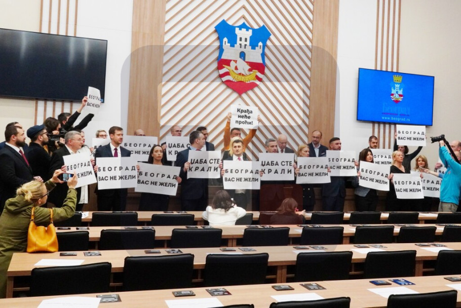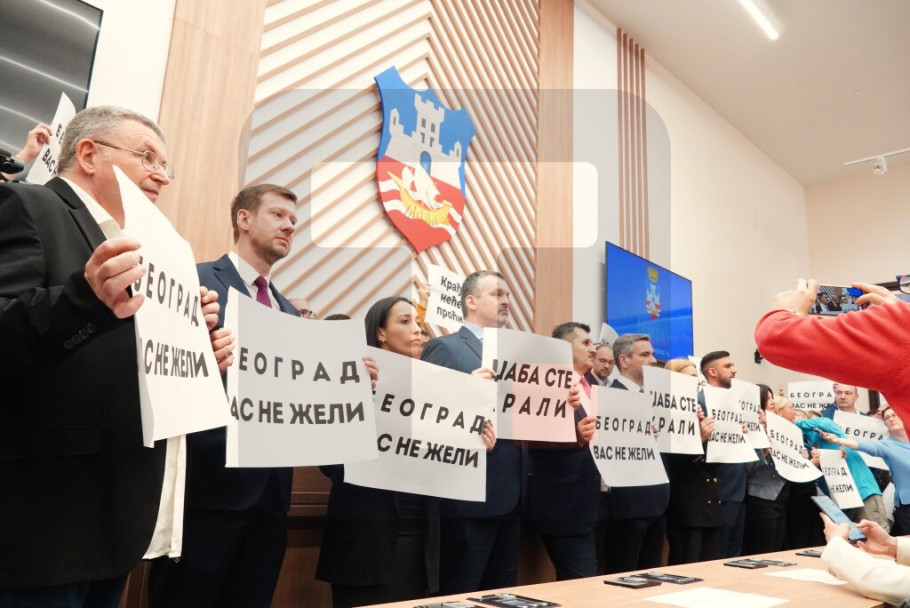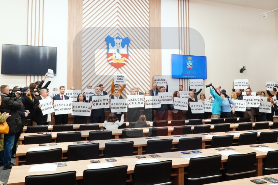 Filu su dok je govorio odbornici opozicije zaklonili trasparentima na kojima je pisalo, između ostalog, "Beograd vas ne želi”.
