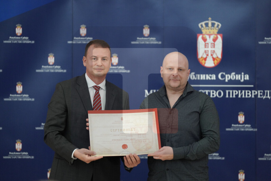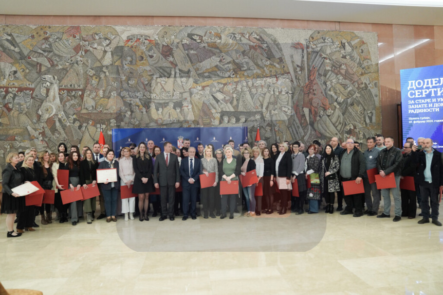 "Kroz postupak sertifikacije i dodele sertifikata stvara se mogućnost dodatnog brendiranja proizvoda starih i umetničkih zanata i domaće radinosti kao ručno izrađenih proizvoda tehnikama i alatima tradicionalnih zanata sa estetskim obeležjima izraženim narodnom umetnošću", rekao je Cvetković na svečanosti pre dodele sertifikata, u Palati Srbija.