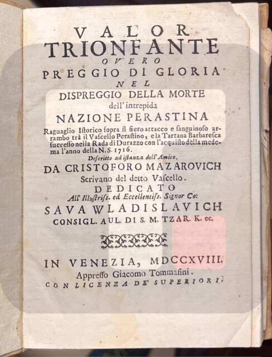 BEOGRAD - Zahvaljujući sredstvima Ministarstva kulture Republike Srbije, Narodna biblioteka Srbije nabavila je staru i retku knjigu Krsta Mazarovića "Pobednička vrlina ili cena slave u preziru smrti nepobedive peraške nacije...". (Cristoforo Mazarovich: Valor trionfante overo preggio di gloria nel dispreggio della morte dell intreoida nazione perastina...), saopštili su iz Ministarstva kulture.