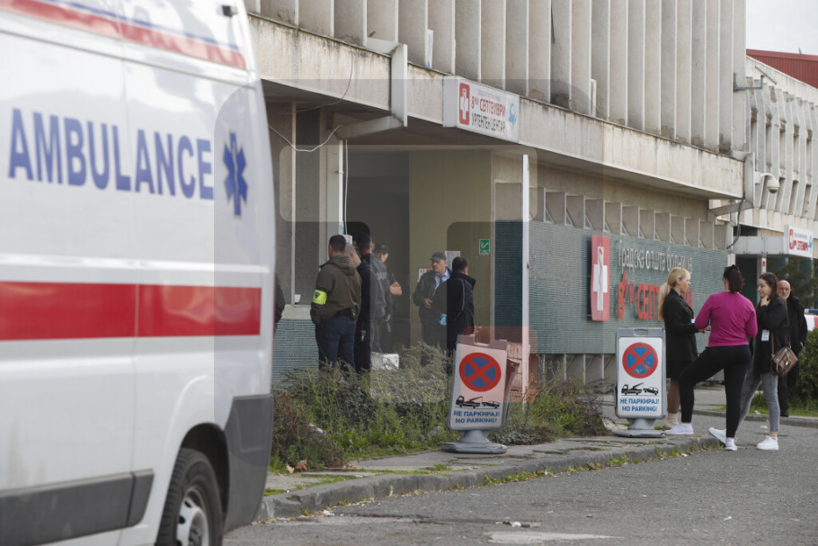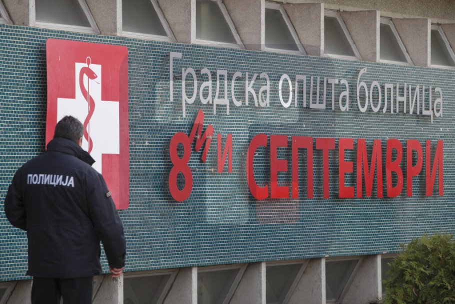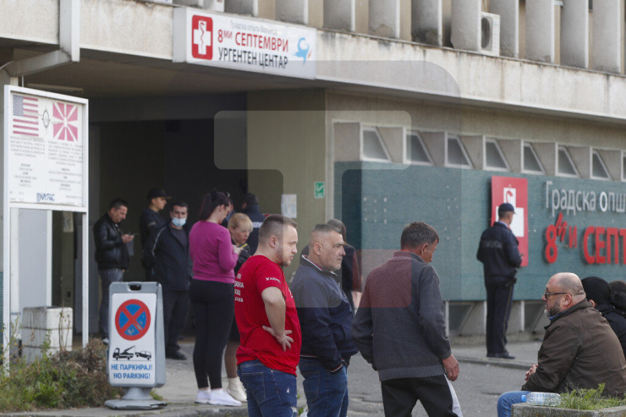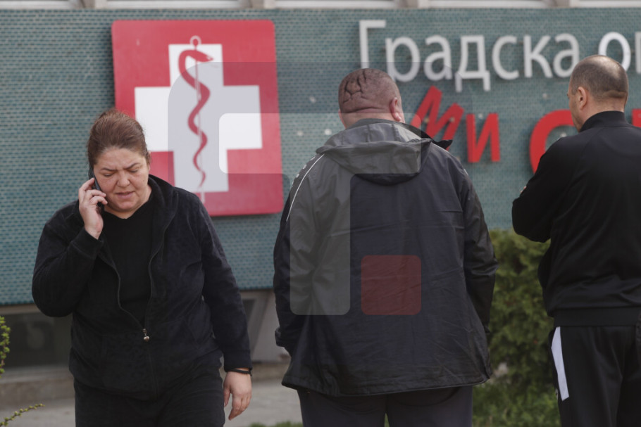 Ispred bolnice je pojačano prisustvo policije, a skopski tužilac roditeljima objašnjava zakonsku proceduru i potrebu za dodatnom obdukcijom.