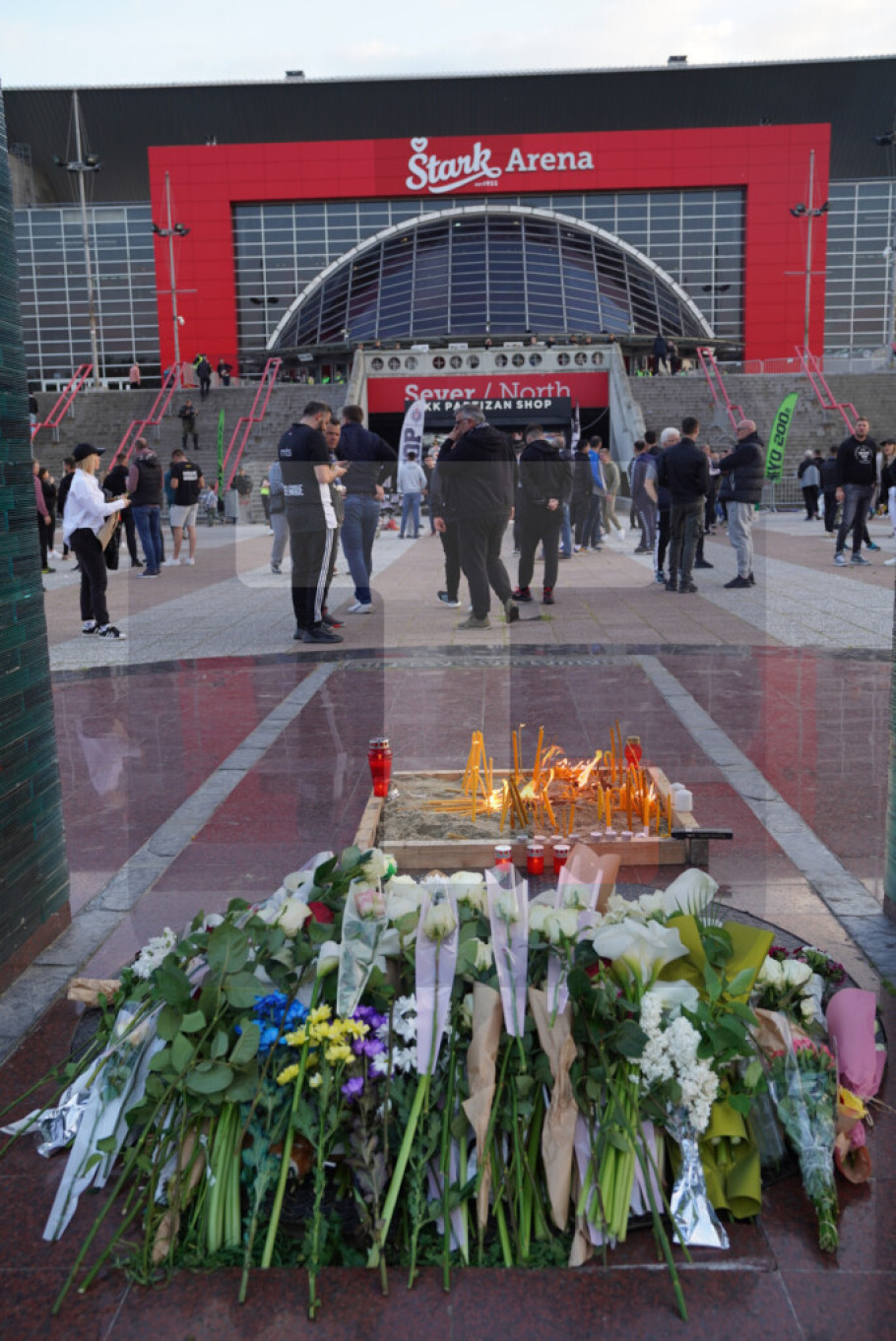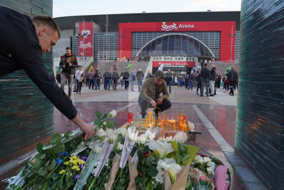 BEOGRAD - Hiljade navijača Partizana odali su večeras ispred beogradske Arene cvećem i svećama počast stradalima u beogradskoj školi "Vladislav Ribnikar", gde je učenik ubio devet osoba.