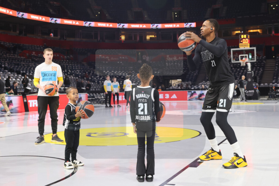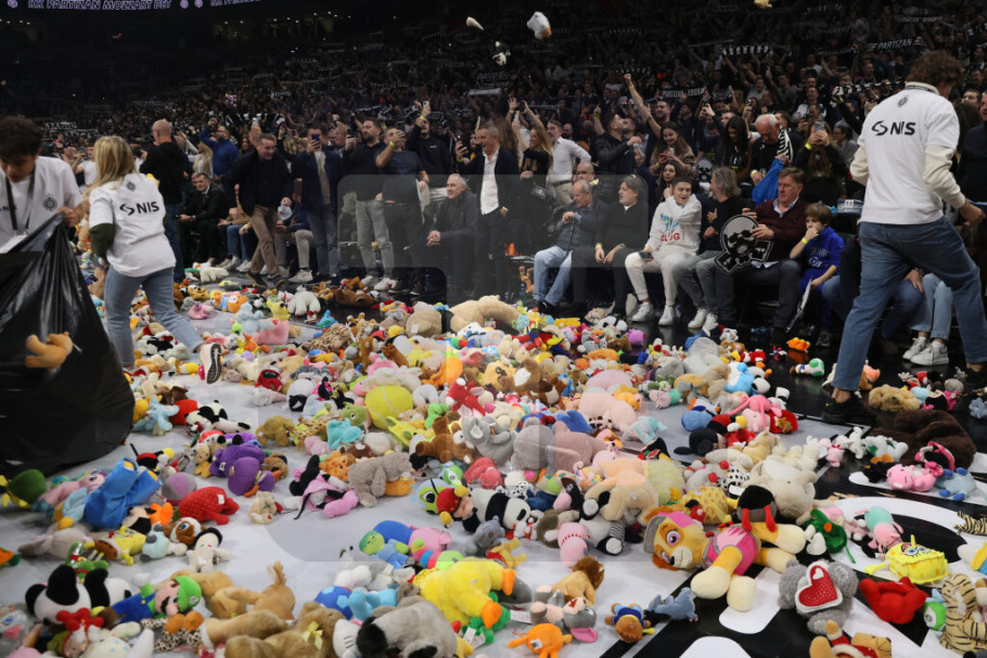 Utakmica je imala humanitarnu uvertiru, više od 10 hiljada plišanih igračaka zasulo je parket Arene, a jedna kompanija će za svaku ubačeni igračku donirati po 1.000 dinara za socijalno ugroženu decu.