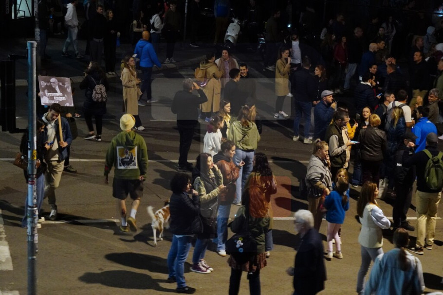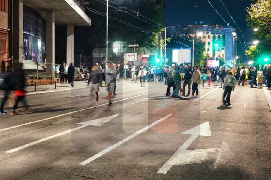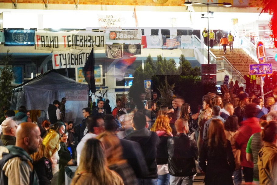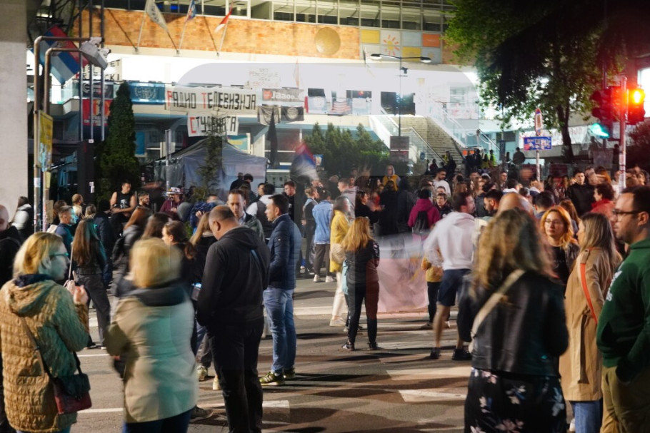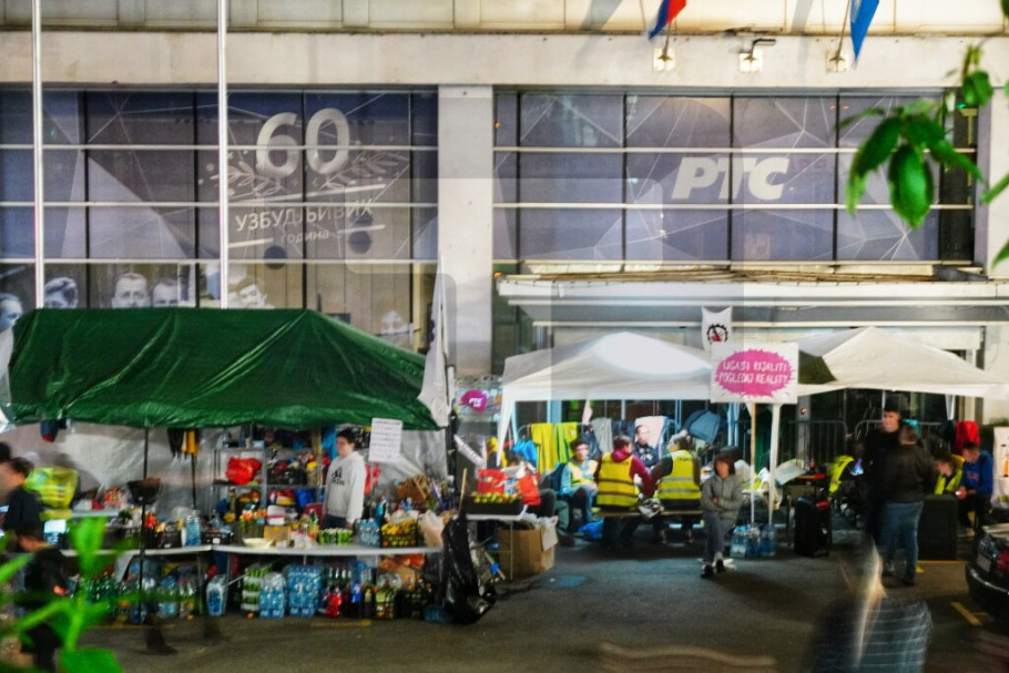 Ispred zgrade RTS-a u Takovskoj prisutan je mali broj studenata u blokadi, a skandiranje i oglašavanje pištaljki i vuvuzela je sporadično.