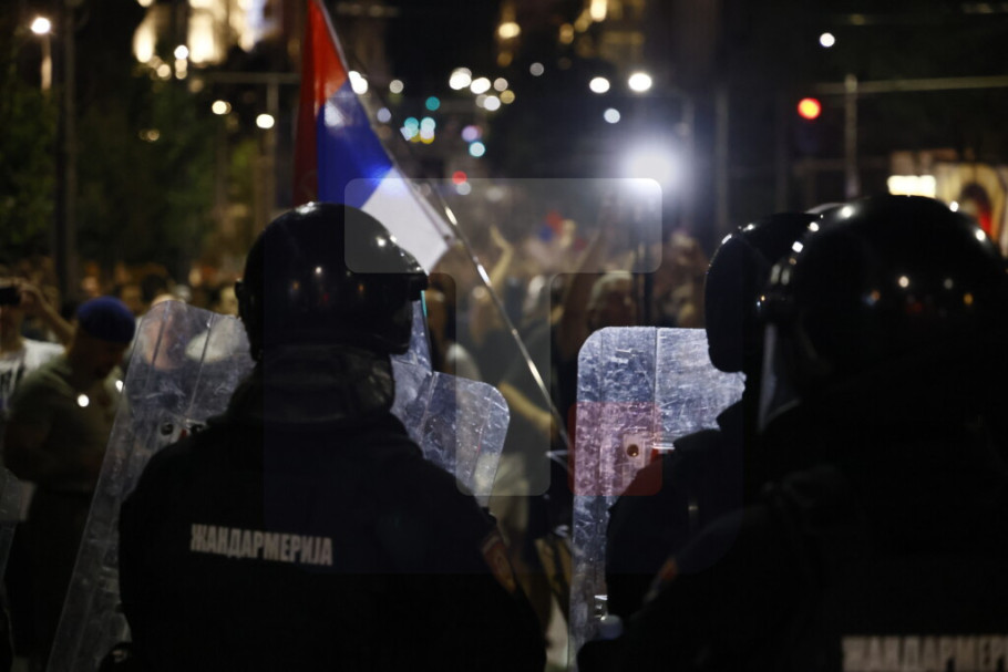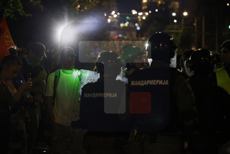 Žandarmerija je krenula i sa vozilima za razbijanje demonstracija, javlja izveštač Tanjuga. Mogu se čuti i topovski udari, a zapaljeno je i jedno drvo.