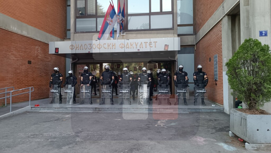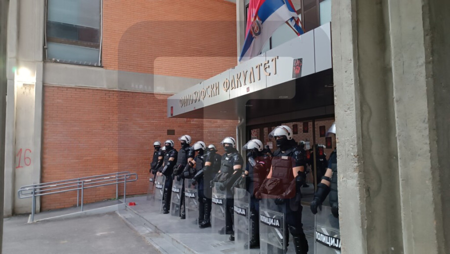 Skup ispred glavnog ulaza Fakulteta pod nazivom „Filozofski te zove“ protiče mirno, ispred zgrade je raspoređen kordon policije, a u blizini se nalazi još nekoliko policijskih vozila.