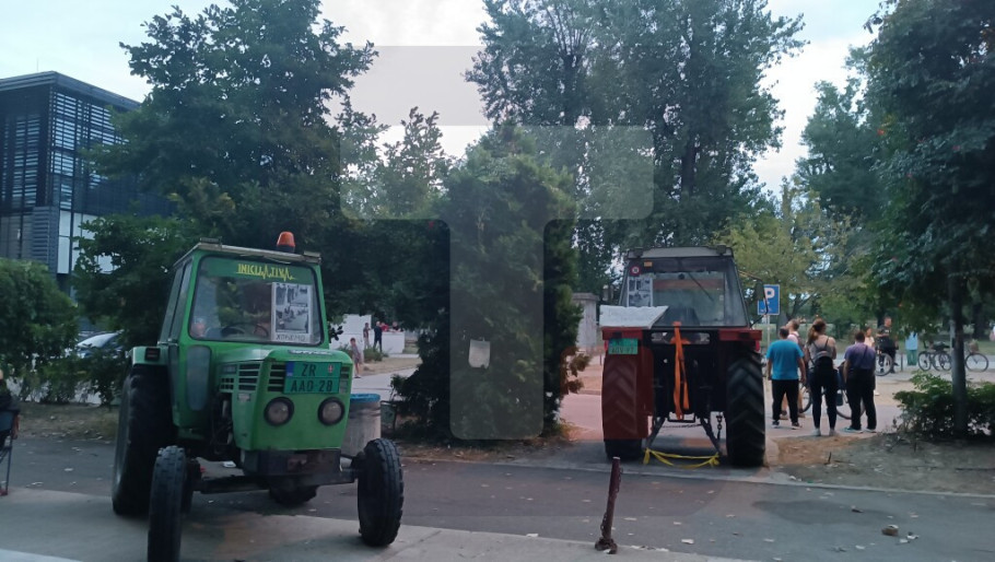 Ulica ispred fakulteta je blokirana za saobraćaj, a na platou ispred zgrade i dalje je parkirano nekoliko traktora.