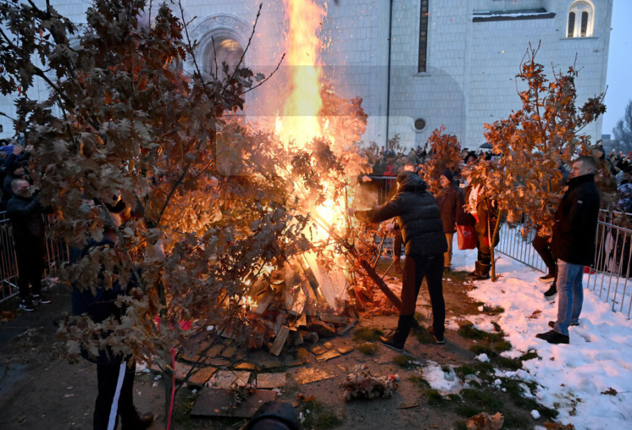 BEOGRAD - Ispred Hrama Svetog Save u Beogradu na Badnje veče tradicionalno je zapaljen badnjak u prisustvu velikog broja vernika.