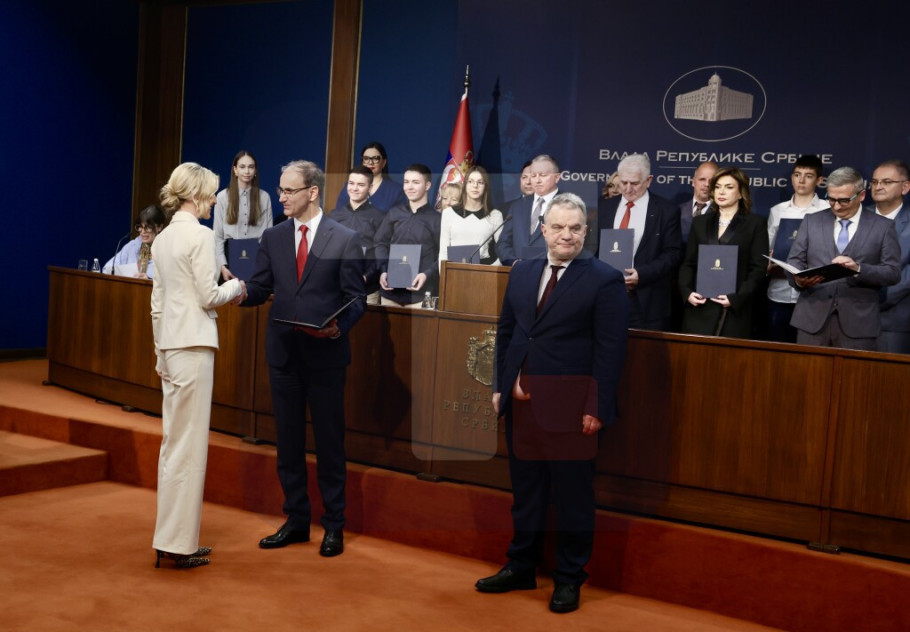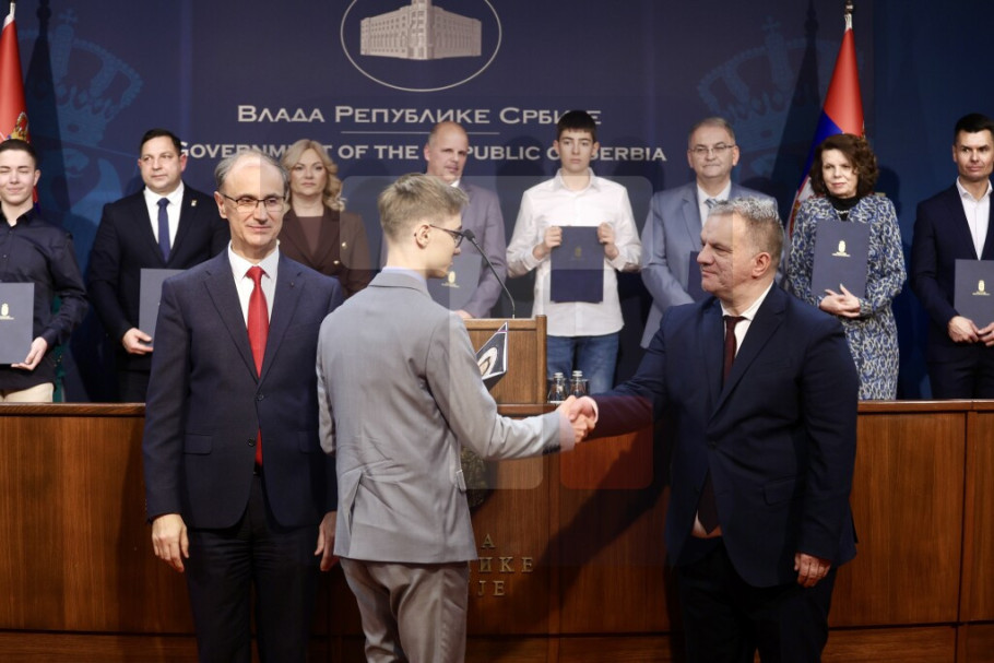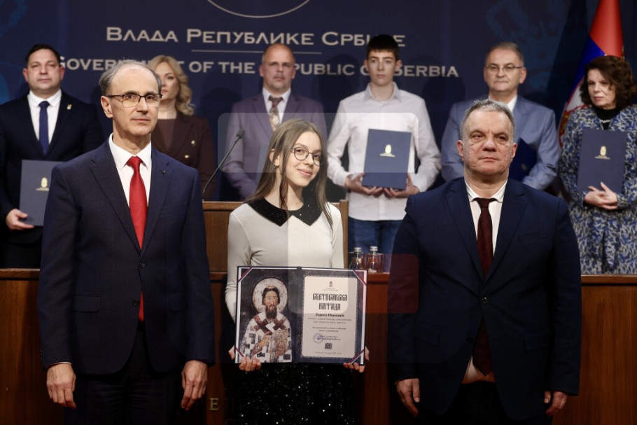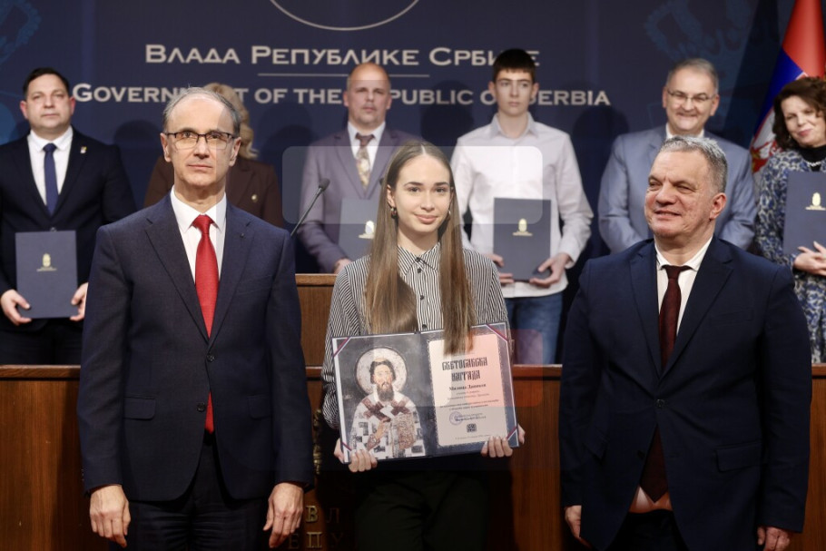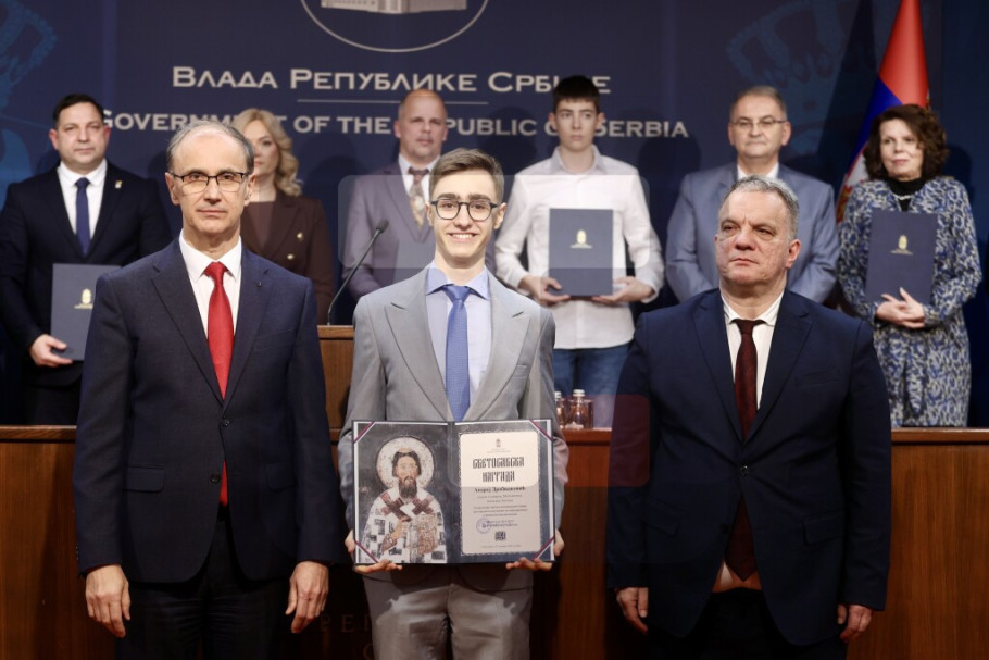 Predsednik Vlade Srbije Đuro Macut i ministar prosvete Vuk Dejan Stanković uručili su danas, na ceremoniji u Vladi Srbije, 31 Svetosavsku nagradu pojedincima i institucijama za postignute izuzetne rezultate u oblasti obrazovanja i vaspitanja za 2025. godinu.