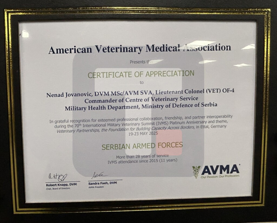 Potpukovnik Vojske Srbije Nenad Jovanović dobitnik priznanja Udruženja veterinara SAD
