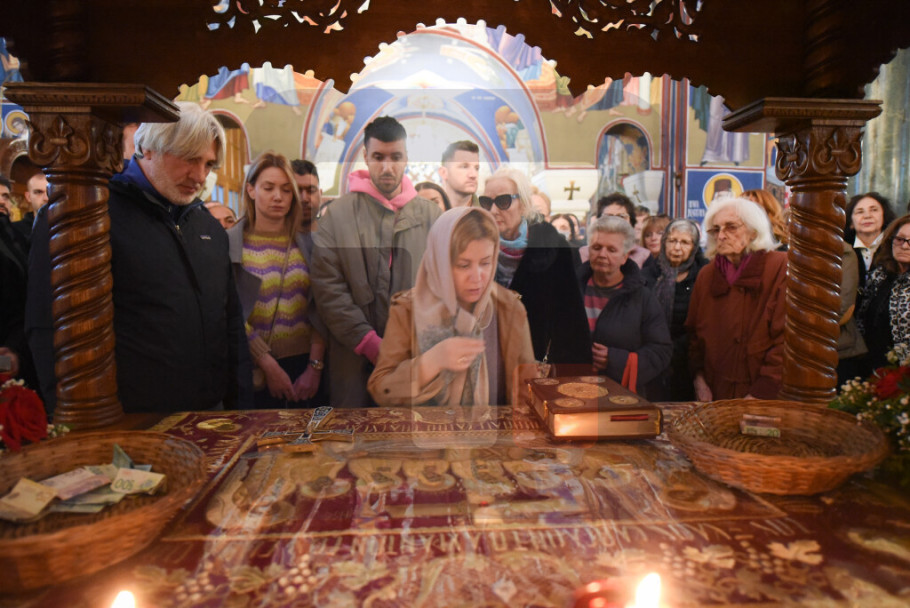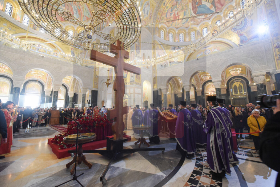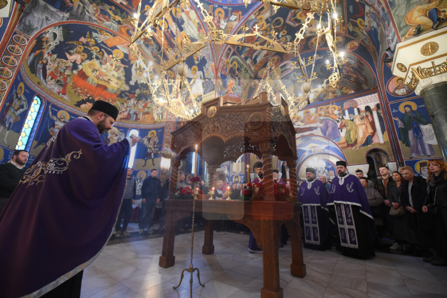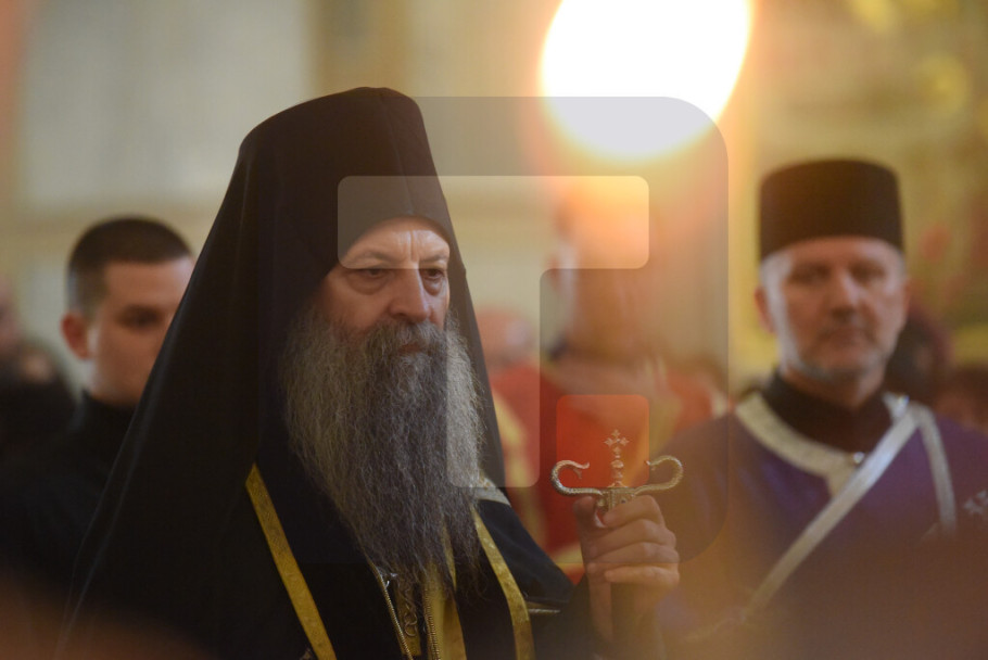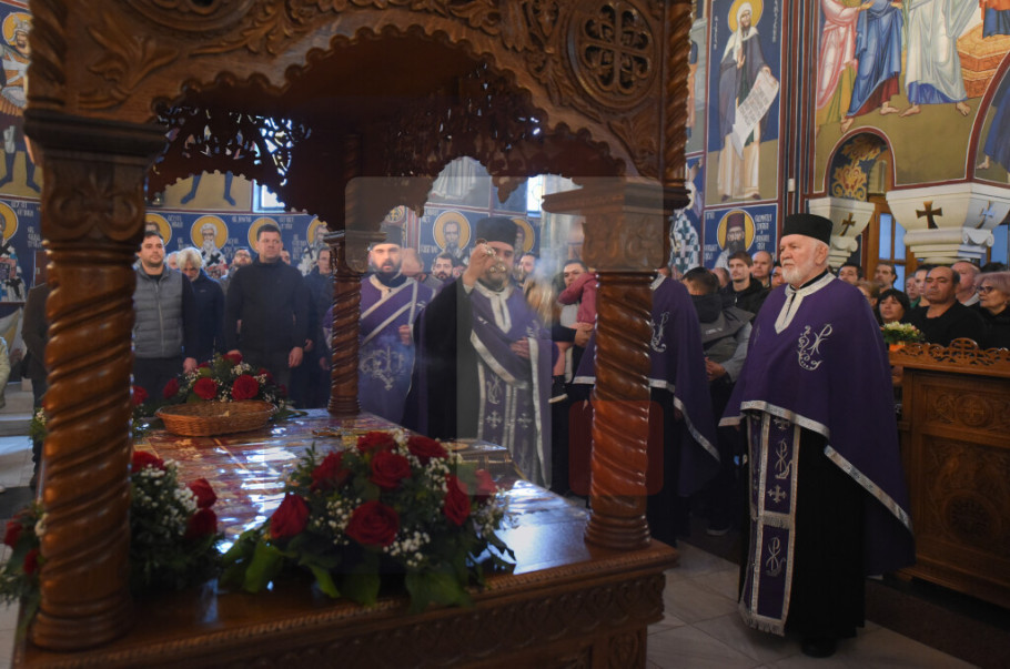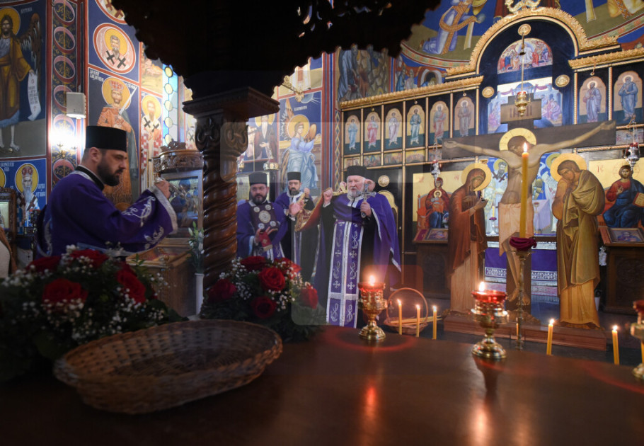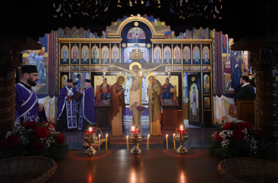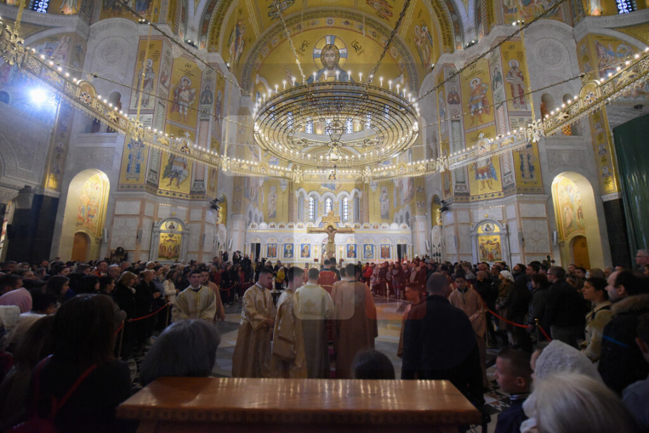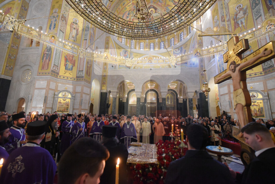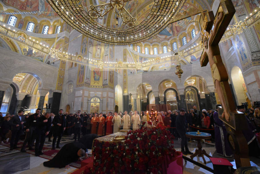 BEOGRAD - Patrijarh SPC Porfirije služio je večernje Velikog petka u Hramu Svetog Save tokom kojeg je izneta plaštanica, platno koje simbolizuje stradanje Isusa Hrista.