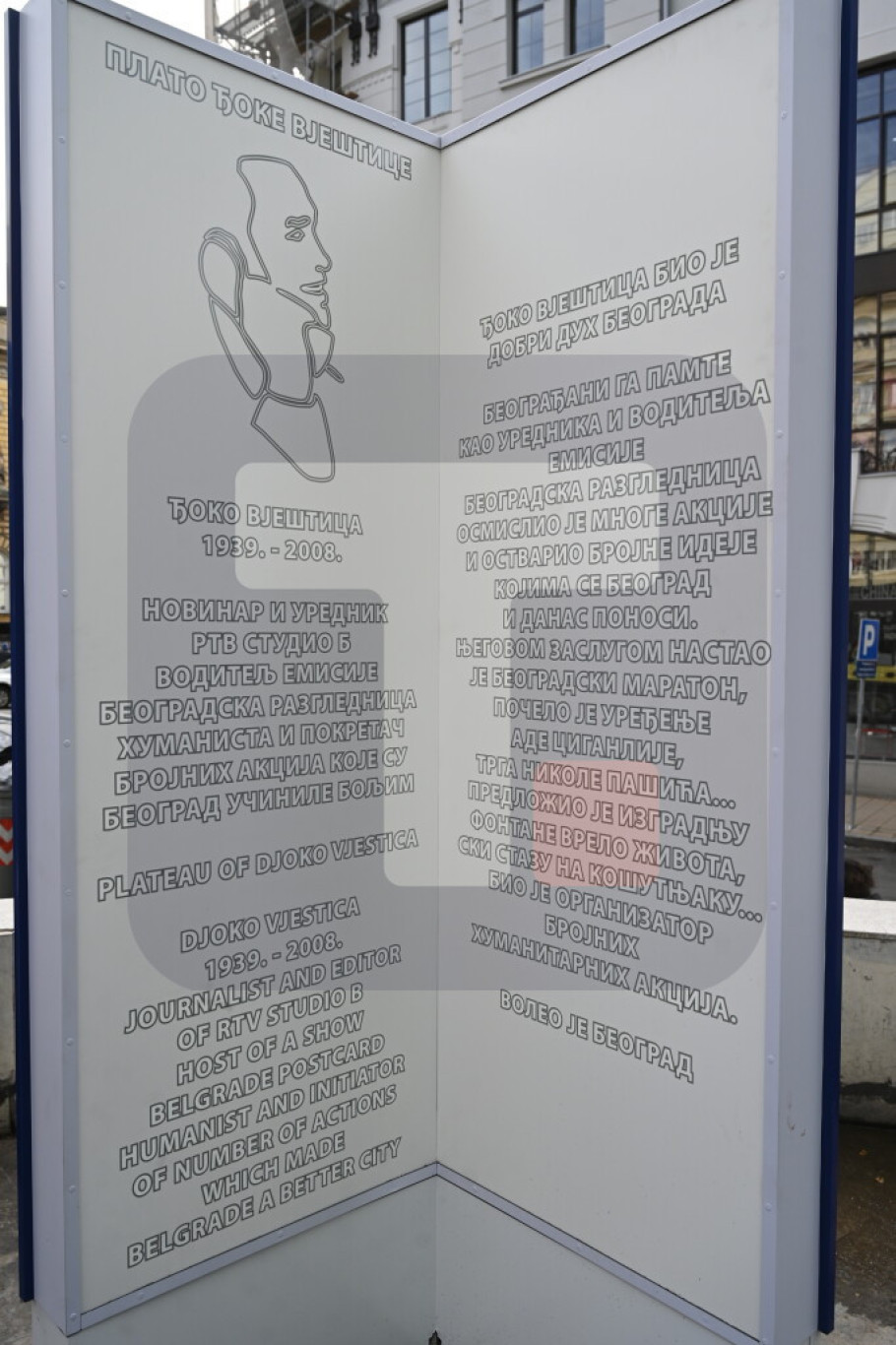 Ovo obeležje otkriveno je na rođendan Studija B, 1. aprila 2012. godine, kada je i čitav plato ispred Palate „Beograd” poneo ime Đoke Vještice, ali je polomljeno 2019. godine.