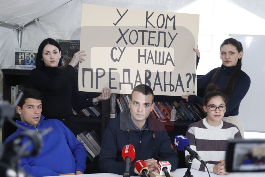 BEOGRAD - Student Fakulteta političkih nauka Luka Lalošević rekao je danas studenti koji žele da uče žele jednaka prava za sve studente i ocenio da nije normalno da se predavanja održavaju u hotelima.