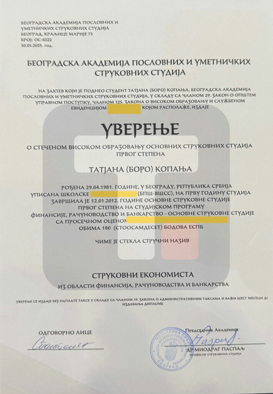 Ona je u otvorenom pismu javnosti to potvrdila javno dostupnim uverenjem o svom diplomiranju.