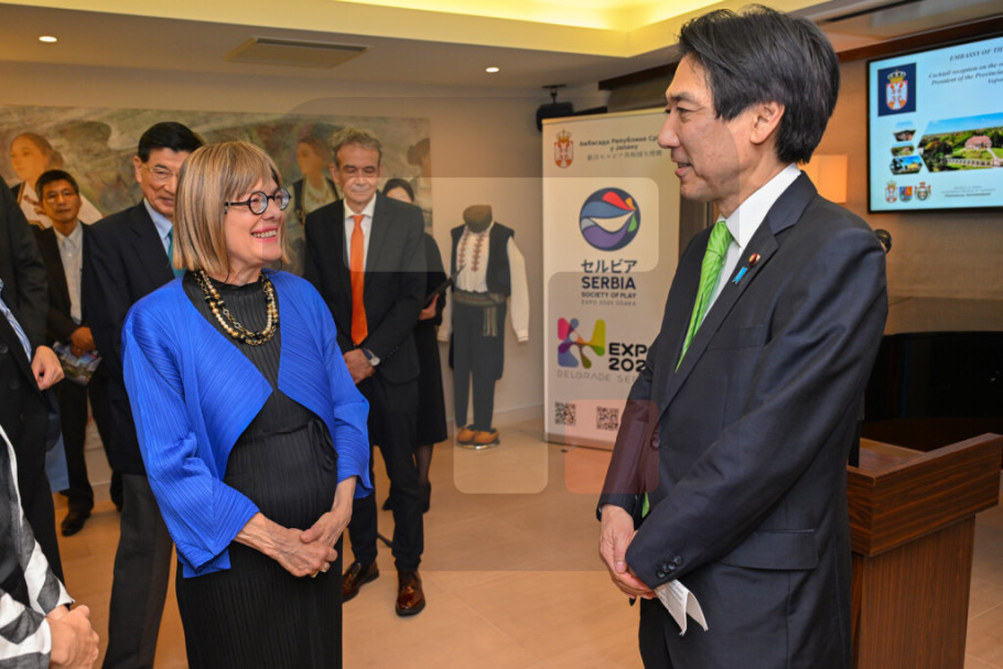 TOKIO - U Ambasadi Srbije u Tokiju danas je održan prijem povodom učešća delegacije Pokrajinske vlade na Svetskoj izložbi "Ekspo 2025" u Osaki, tokom kojeg su zvanično predstavljeni privredni, kulturni i turistički potencijali AP Vojvodine, a predsednica Pokrajinske vlade Maja Gojković istakla je da je učešće na Ekspu značajna prilika za afirmaciju AP Vojvodine i Srbije, kao i za unapređenje odnosa sa Japanom.