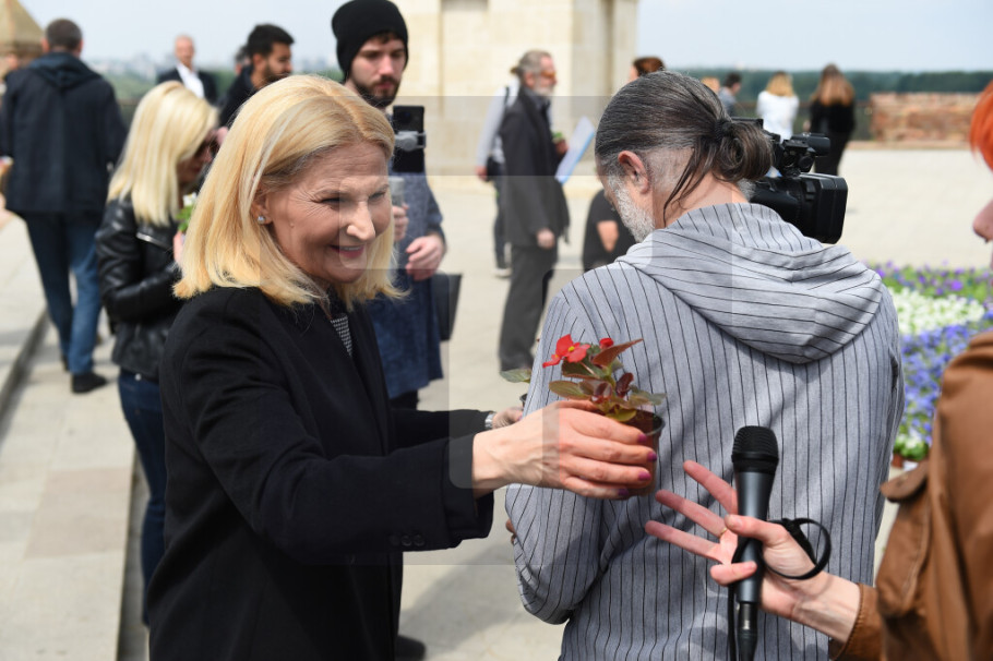 "Nažalost danas nemam citat za vas, jer je danas jako teško. Danas je važna solidarnost i podrška koju ovde na Kalemegdanu i u ovoj divnoj poseti svih ambasadora država članica EU, i u cveću koje će biti podeljeno bolnicama, školama i raznim institucijama, da bi svi oni koji su danas ovde odneli kući da se podsete, ne samo 9. maja nego i ovog tužnog 9. maja", rekla je Miščević.
