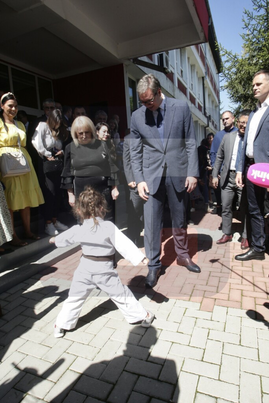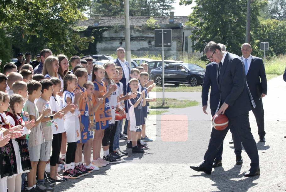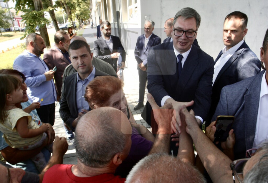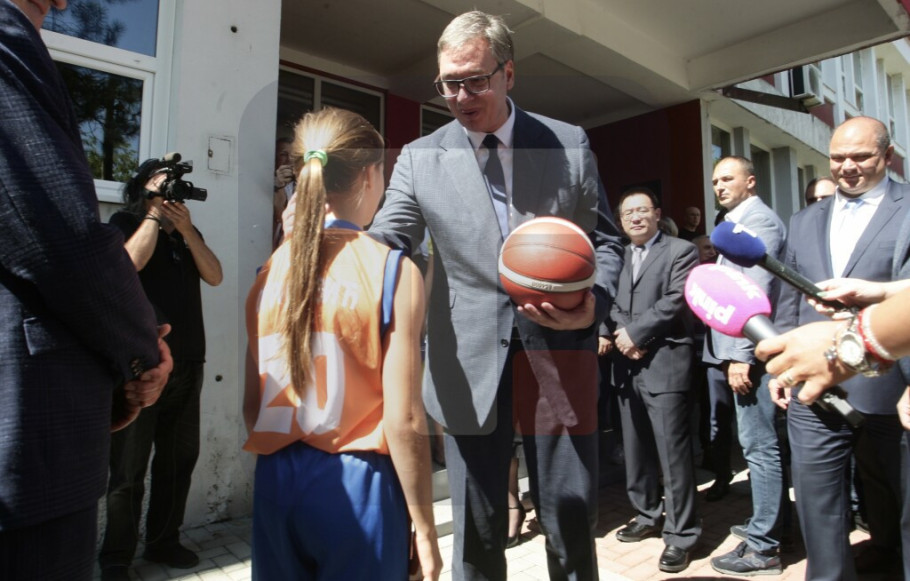Predsednika Srbije je ispred škole dočekao veliki broj građana i dece, sa kojima se pozdravio.