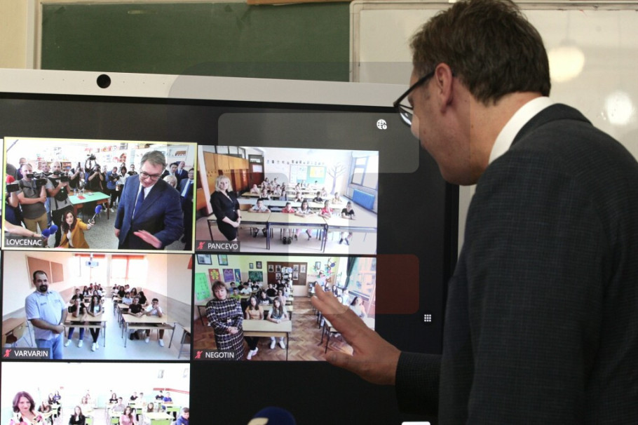 Vučić se prilikom obilaska Osnovne škole "Vuk Karadžić" u Lovćencu, kojoj su uručene Huawei IdeaHub table, obratio i đacima u drugih šest škola koje su, osim ove, dobile table i to u Krupnju, Pančevu, Petrovcu, Varvarinu, Negotinu i Merošini.