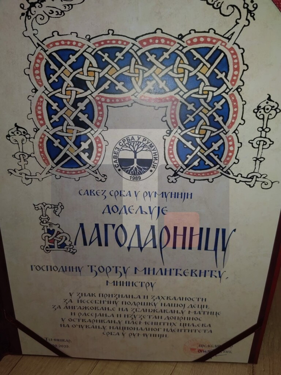 Savez Srba u Rumuniji dodelio je danas ministru Milićeviću specijalno priznanje - „Blagodarnicu“ u znak zahvalnosti za nesebičnu podršku koju pruža srpskom narodu u Rumuniji kako bi očuvao svoj nacionalni identitet, kao i za angažovanje na zbližavanju matice i rasejanja, navodi se u saopštenju.