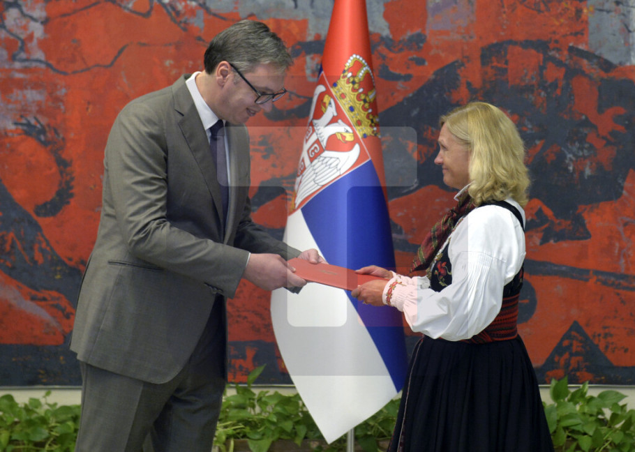 "Sa posebnim zadovoljstvom primio sam danas akreditivna pisma novoimenovane ambasadorke Kraljevine Norveške Kristin Melosom, kao i ambasadora Republike Finske i Kraljevine Kambodže, Niklasa Lindkvista i Bunpe Tana", naveo je Vučić na Instagram nalogu "buducnostsrbijeav".