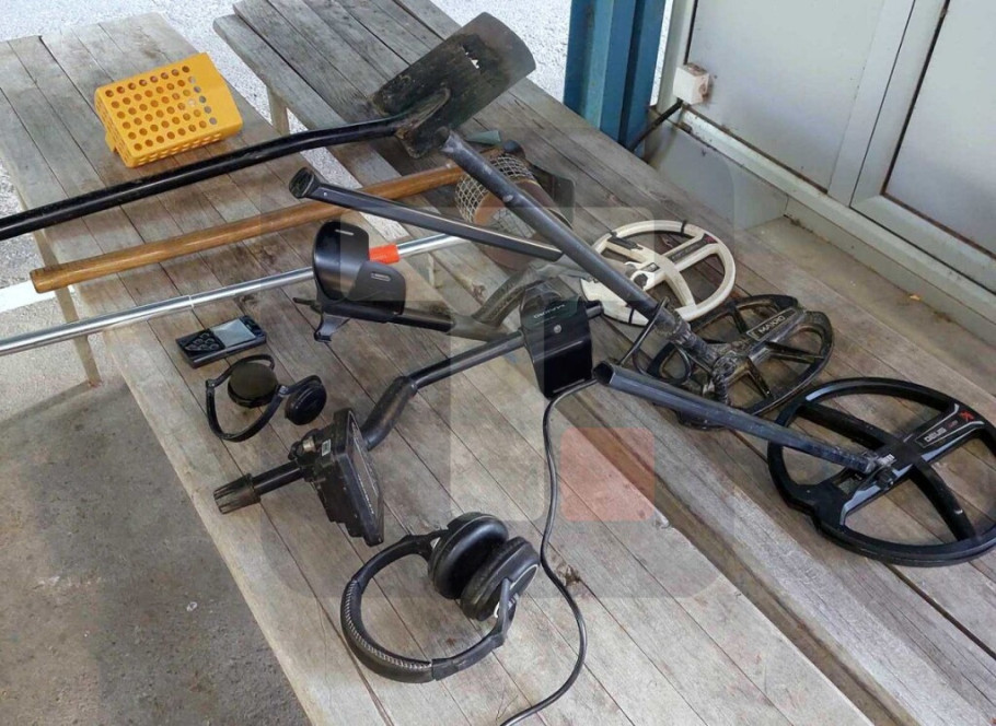 Već na samom početku pregleda u fabričkoj šupljini prtljažnika pronađena je sakrivena kompletna arheološka oprema: dva profesionalna metal detektora, bežične slušalice i daljinski upravljač, tri ašova, tri sejalice i pijuk.