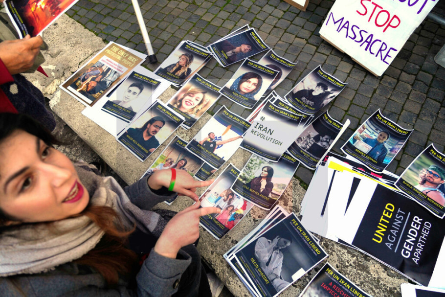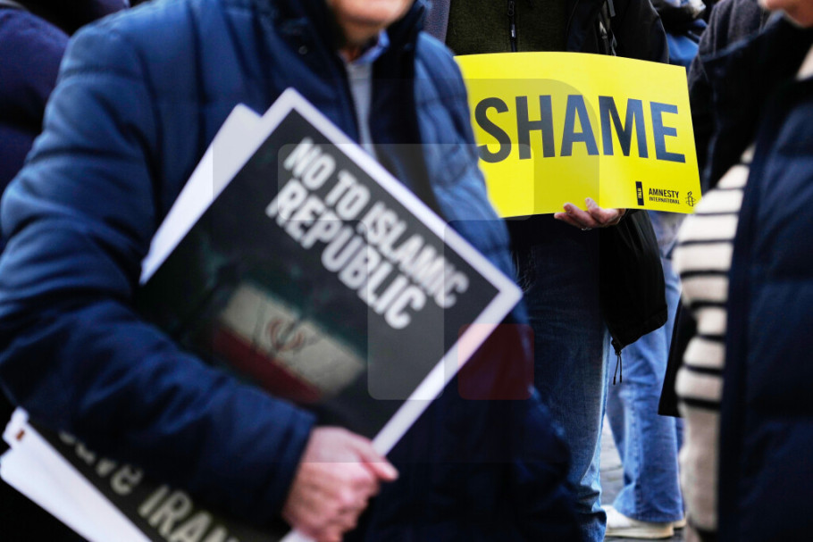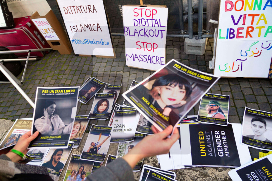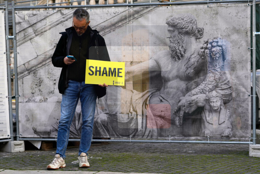 Na trgu su, prenosi ANSA, istaknuti transparenti Amnesti internešnela i pokreta "Žena, život, sloboda", među kojima i žuti transparent sa porukom "Sramota".