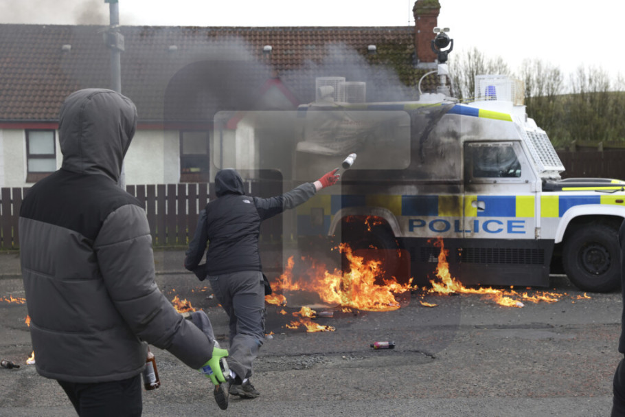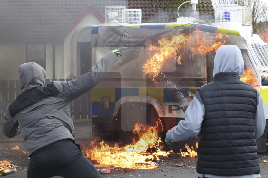 Navodi se da je četvoro mladih ljudi u pretežno irskom nacionalističkom području Kregan prikazano na fotografiji kako bacaju benzinske bombe na oklopno policijsko vozilo, koje je sa jedne strane bilo prekriveno plamenom, preneo je Rojters.