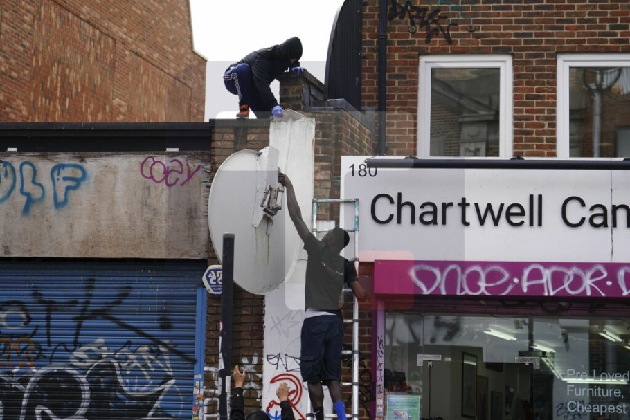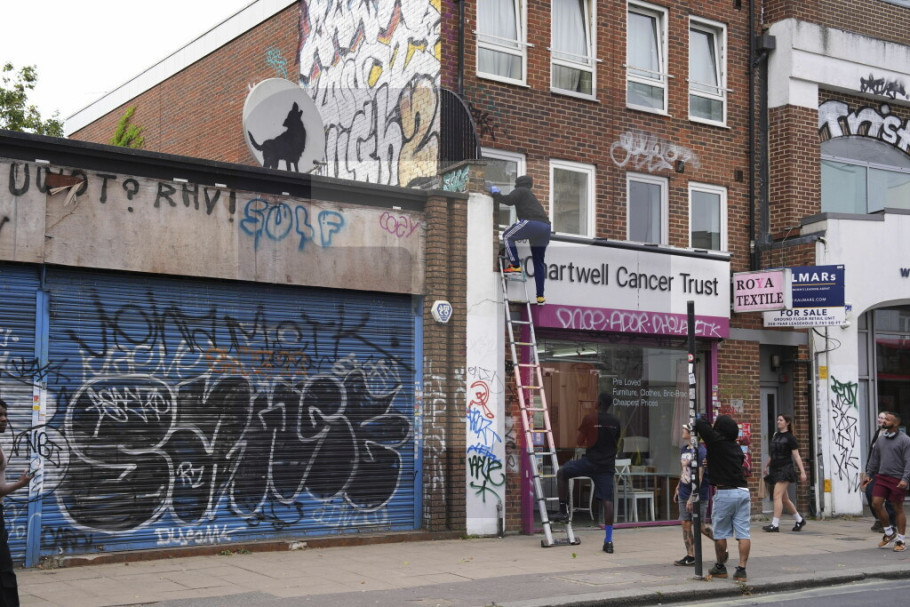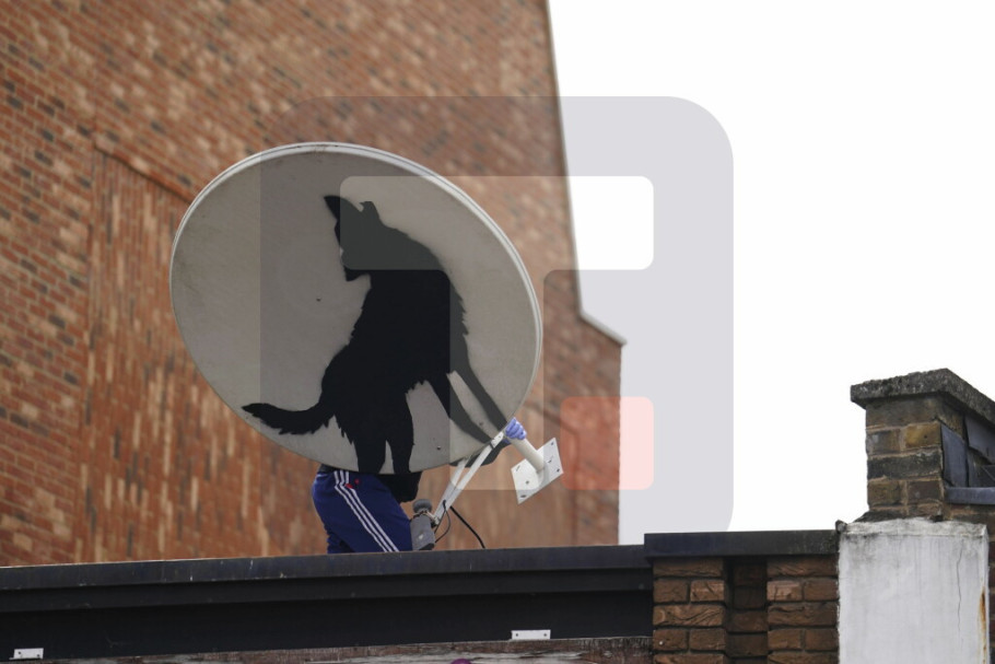 U pitanju je grafika vuka koji gleda prema nebu, što je četvrta u Benksijevoj novoj kolekciji radova, a naslikana je na satelitskoj anteni na krovu zgrade, piše Gardijan.